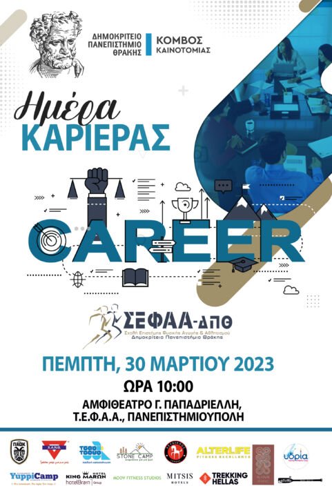 Την Πέμπτη 30 Μαρτίου 2023, και ώρες 10:00-12:30, στο Μεγάλο Αμφιθέατρο της Σχολής Επιστήμης Φυσικής Αγωγής και Αθλητισμού του Δ.Π.Θ., στην Πανεπιστημιούπολη Κομοτηνής, θα διοργανωθεί η 5η Ημέρα Καριέρας.
