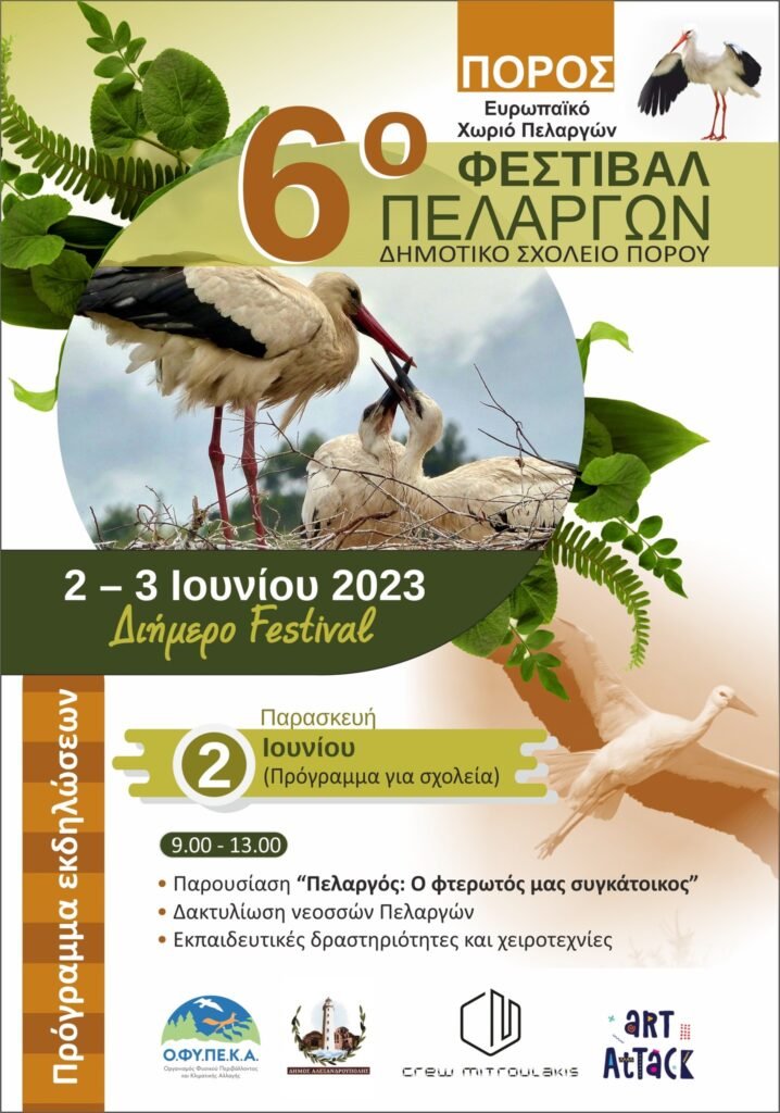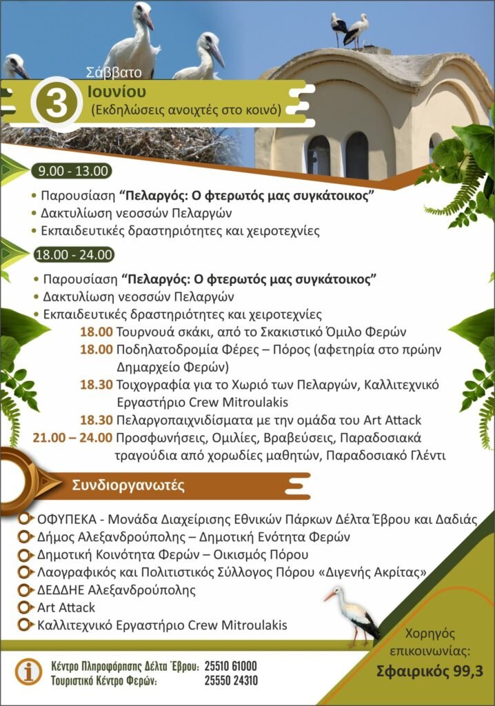 Για ακόμη μια χρονιά έρχεται στον Έβρο, το Φεστιβάλ Πελαργών, το οποίο θα πραγματοποιηθεί για 6η φορά, στο χωριό Πόρος Φερών, την Παρασκευή 2 και το Σάββατο 3 Ιουνίου 2023.