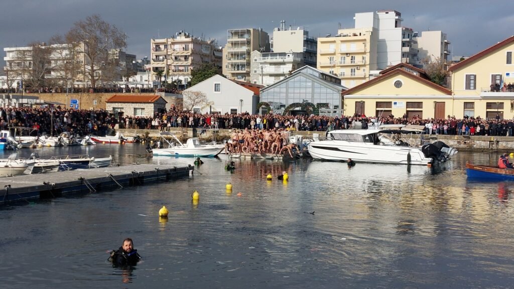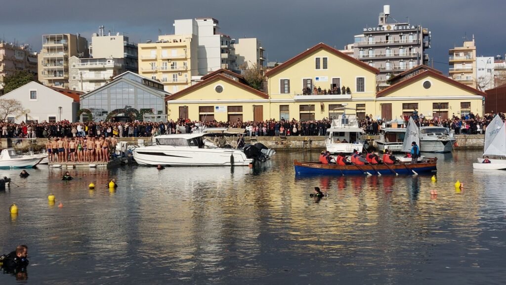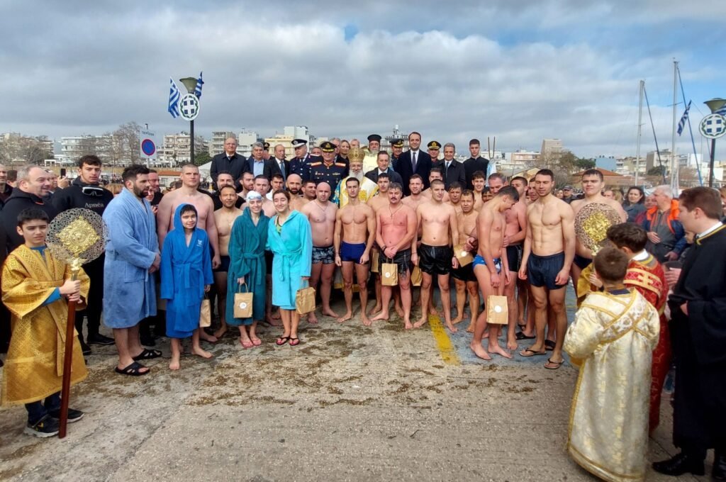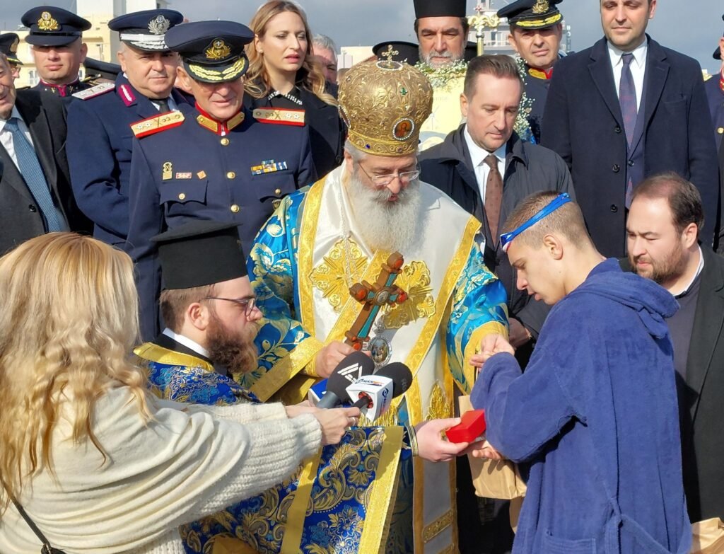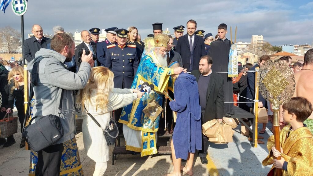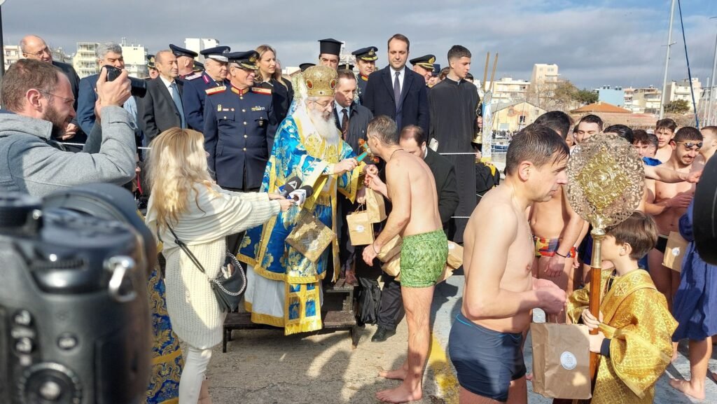 Στη συνέχεια πραγματοποιήθηκε λιτανεία, τη οποία ακολούθησαν εκατοντάδες πιστοί, στους δρόμους της πόλεως καταλήγοντας στο λιμάνι, όπου τελέσθηκε ο αγιασμός των υδάτων και η ρίψη του Τιμίου Σταυρού. Τον Σταύρο έπιασε ο Αντώνιος Πεχλιβανίδης, ο οποίος είναι μαθητής 16 ετών. Ο Ποιμενάρχης μας ευλόγησε όλους τους κολυμβητές που βούτηξαν για να πιάσουν τον Τίμιο Σταυρό δίνοντάς τους ως ευλογία ένα δώρο, ενώ σε αυτόν που έπιασε το Σταυρό έδωσε ως ευλογία επιστήθιο Σταυρό.