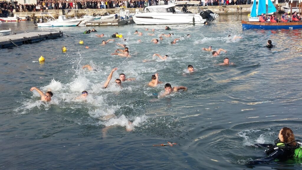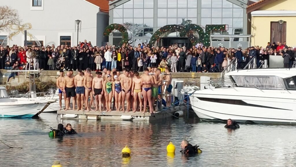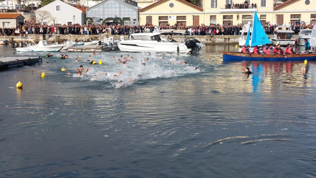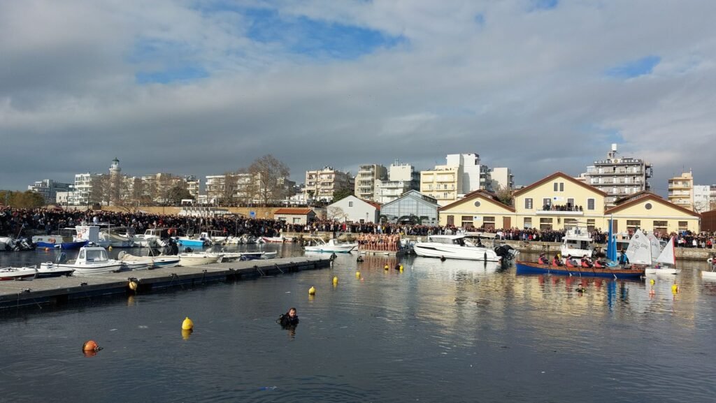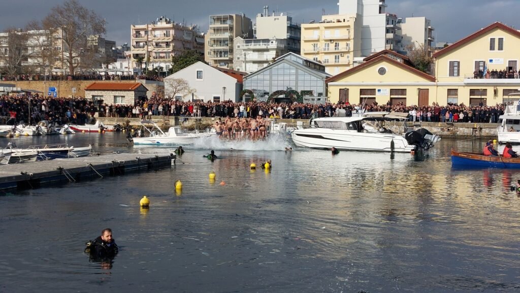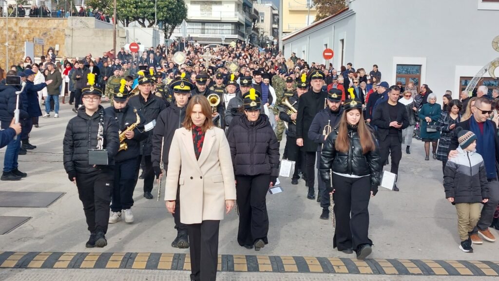 Στη συνέχεια πραγματοποιήθηκε λιτανεία, τη οποία ακολούθησαν εκατοντάδες πιστοί, στους δρόμους της πόλεως καταλήγοντας στο λιμάνι, όπου τελέσθηκε ο αγιασμός των υδάτων και η ρίψη του Τιμίου Σταυρού. Τον Σταύρο έπιασε ο Αντώνιος Πεχλιβανίδης, ο οποίος είναι μαθητής 16 ετών. Ο Ποιμενάρχης μας ευλόγησε όλους τους κολυμβητές που βούτηξαν για να πιάσουν τον Τίμιο Σταυρό δίνοντάς τους ως ευλογία ένα δώρο, ενώ σε αυτόν που έπιασε το Σταυρό έδωσε ως ευλογία επιστήθιο Σταυρό.