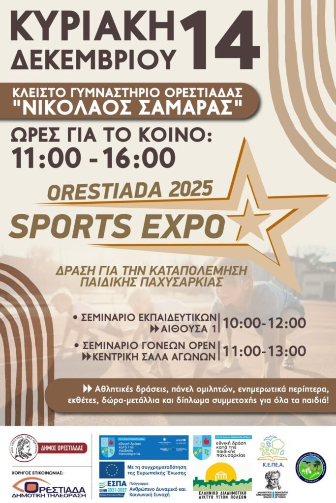 Στην αθλητική έκθεση του Δήμου Ορεστιάδας, θα υπάρχουν ενημερωτικά και εκπαιδευτικά σεμινάρια για εκπαιδευτικούς & γονείς, πάνελ ομιλητών και ανοιχτή συζήτηση, αθλητικά περίπτερα σωματείων της περιοχής, περίπτερα υγείας, παιχνίδια και αθλητικές δραστηριότητες για όλα τα παιδιά, μετάλλια, διπλώματα συμμετοχής, δώρα,πολλές εκπλήξεις και επιδείξεις αθλημάτων.